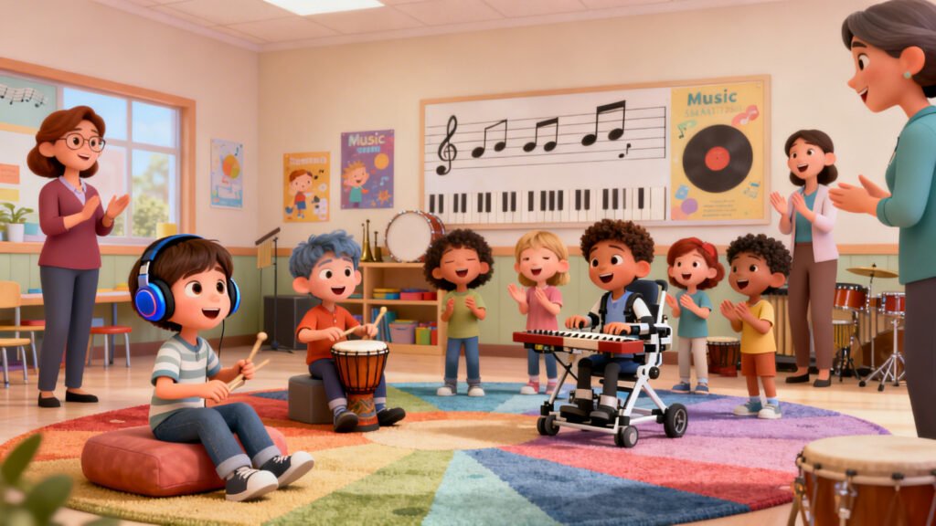 A música também é uma ferramenta extremamente valiosa em contextos de inclusão. Crianças com diferentes perfis de desenvolvimento – como aquelas com TEA, TDAH, deficiências intelectuais ou motoras – podem se beneficiar muito de atividades musicais adaptadas.