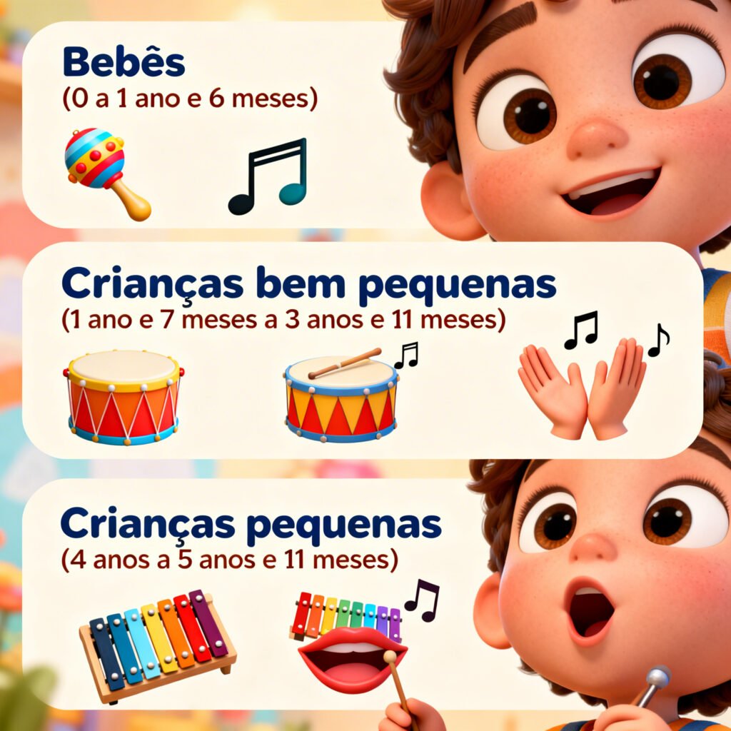 O foco é criar um ambiente sonoro rico e afetivo, no qual a música apoia o vínculo e a segurança emocional.